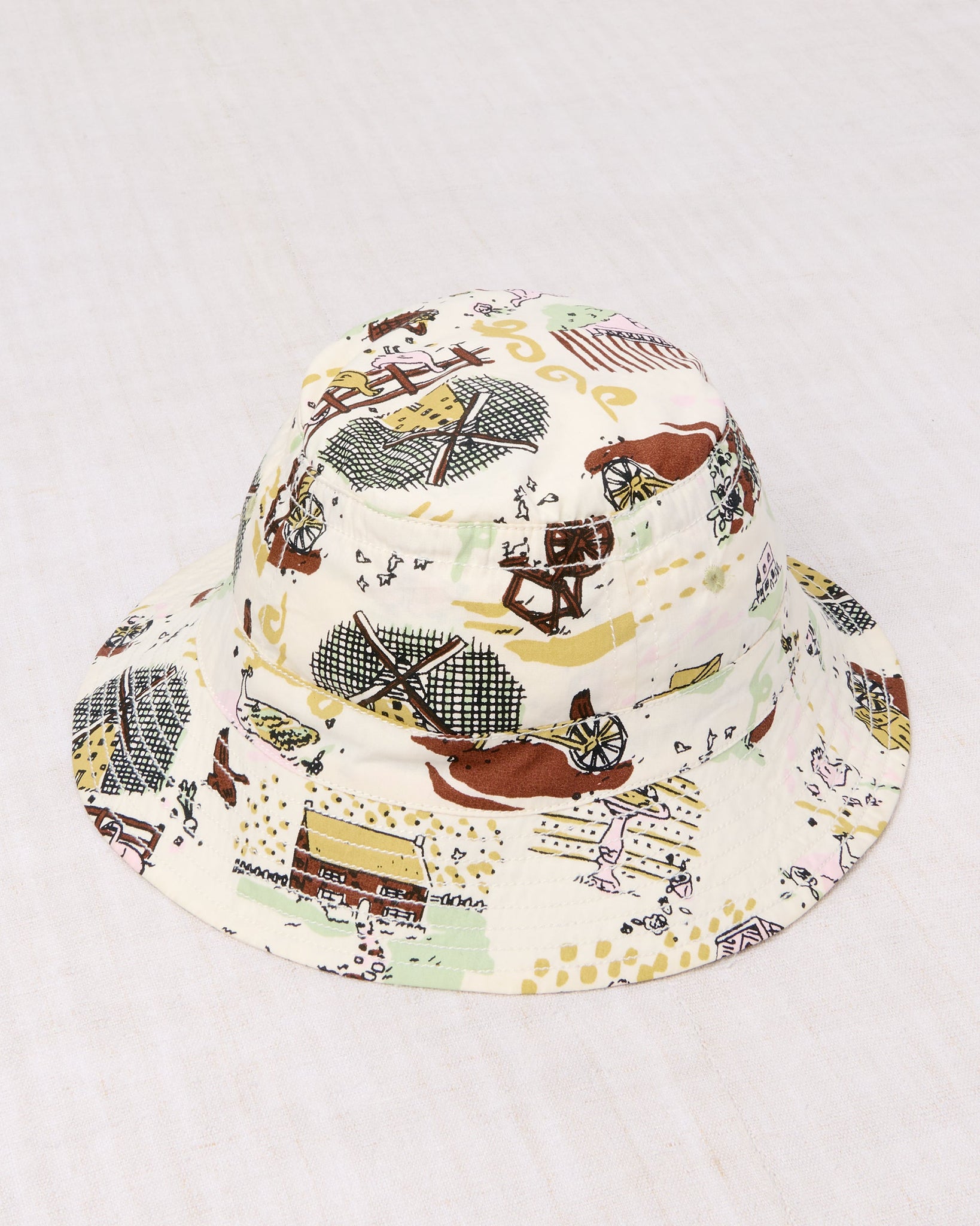 ファームライフがモチーフのプリントがとてもチャーミングなバケットハット。クラシックなデザインで、コーディネートのアクセントとして活躍するアイテムです。ユニセックスでご利用いただけます。