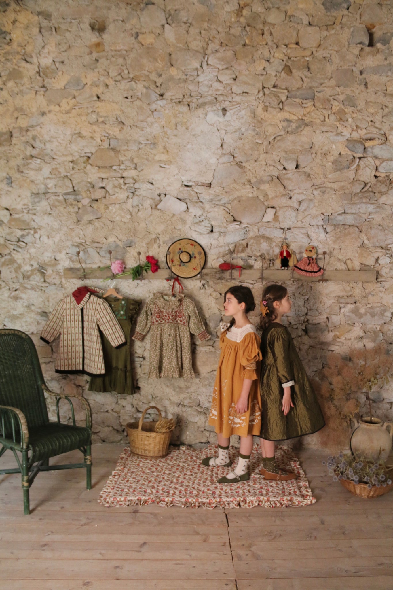 キャラメルカラーがチャーミングなコーデュロイベルベットのワンピース。アイボリーの刺繍入りネックライン、前後に施されたアイボリーの花のハーバリウム刺繍、ふんわりとしたバルーンスリーブとハンド刺繍のスモッキングカフスが特徴です。お揃いのヘアクリップ付きです。