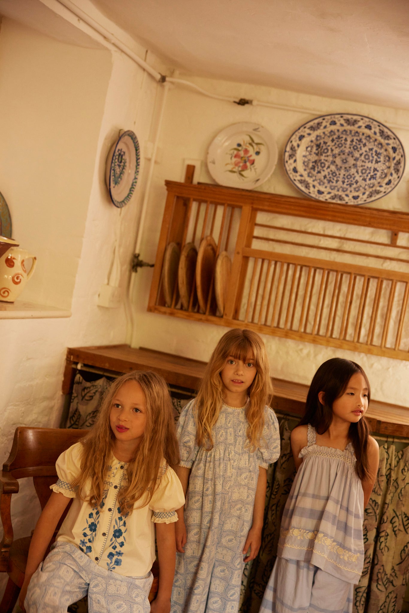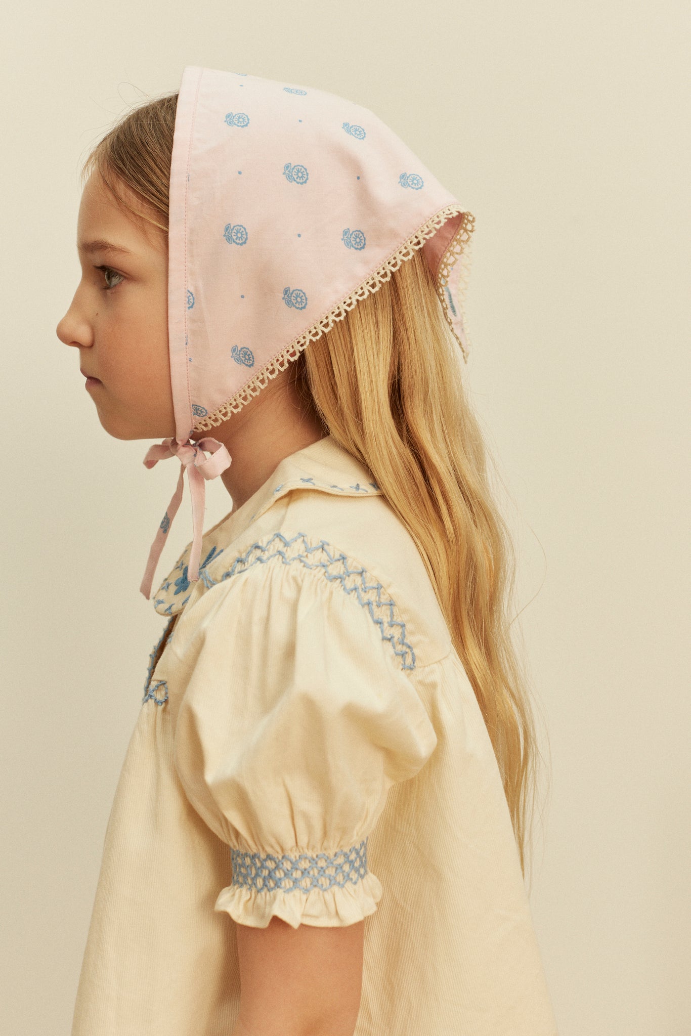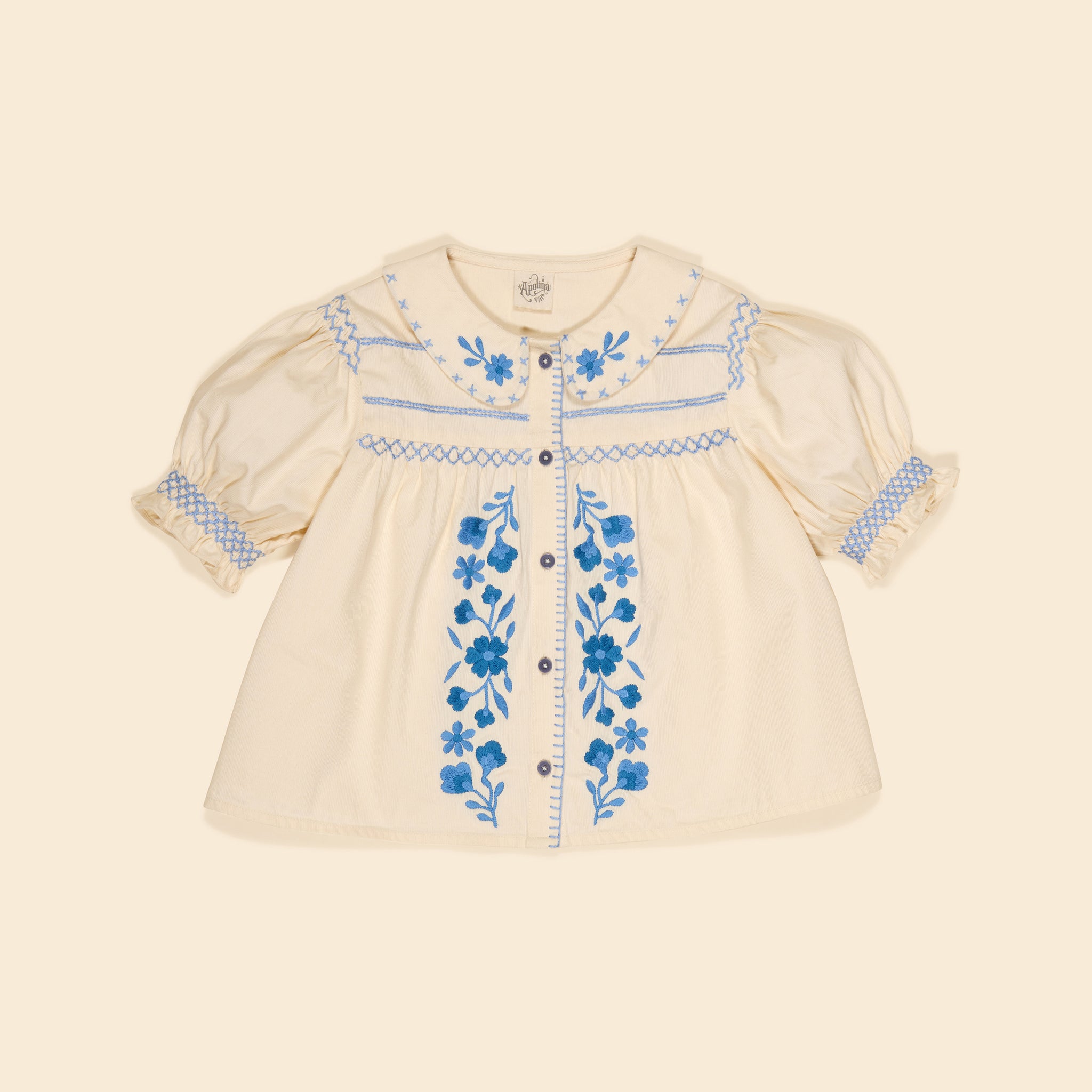 フロントのプラケットと襟には大胆なフラワー刺繍、襟にはクロスステッチ、肩・袖・胸にはハンドスモッキング、プラケットにはブランケットステッチの仕上げが施されています。前ボタン仕様でお着替えも簡単です。