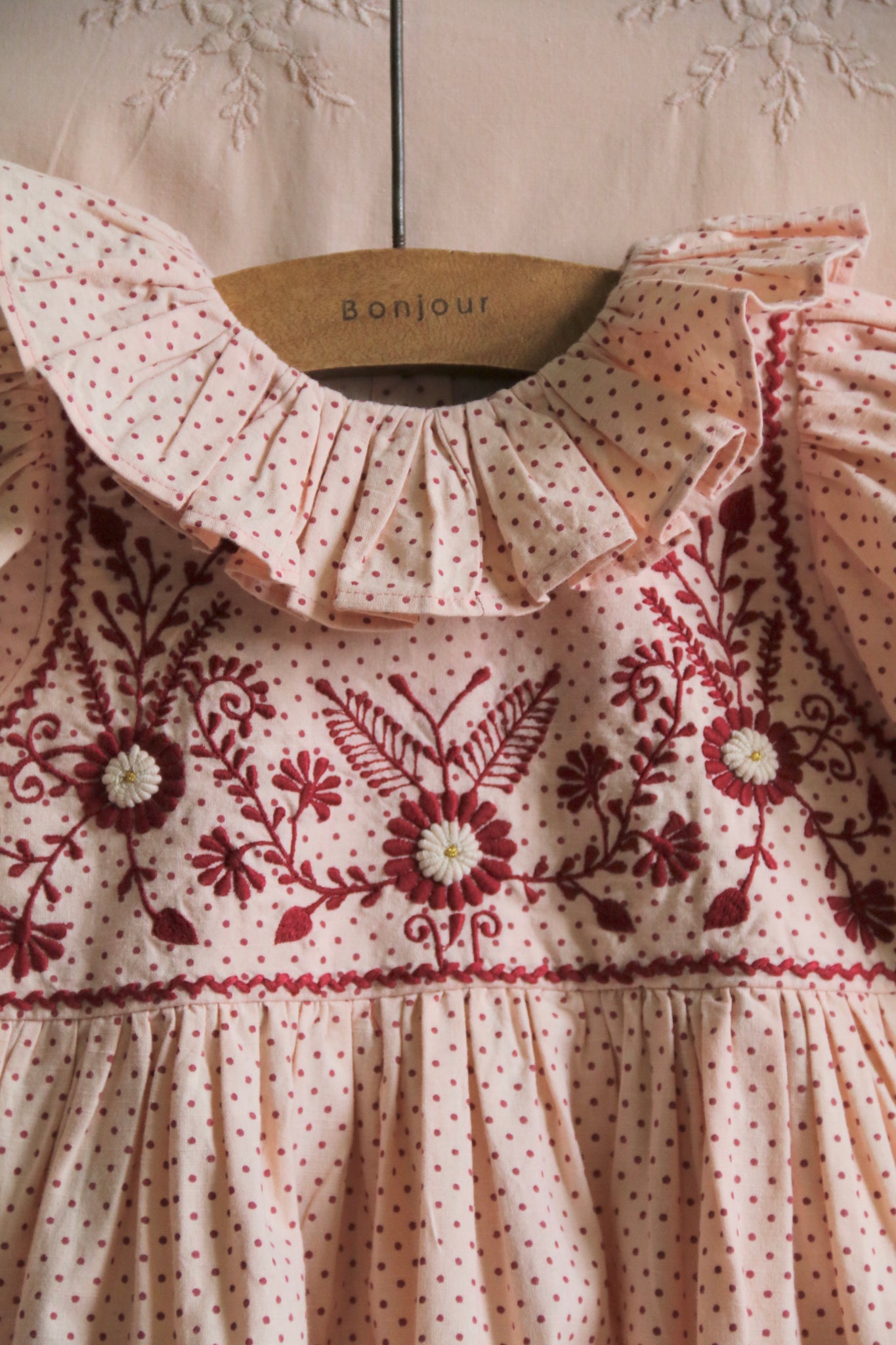 ピンクのコットンキャンバス布地に赤い水玉模様のコントラストがかわいいワンピース。フリル付きの襟、花束の刺繍入りフリル襟、ハンド刺繍のスモッキングカフスが特徴です。特別な一着になること間違いなしのすてきなワンピースです。