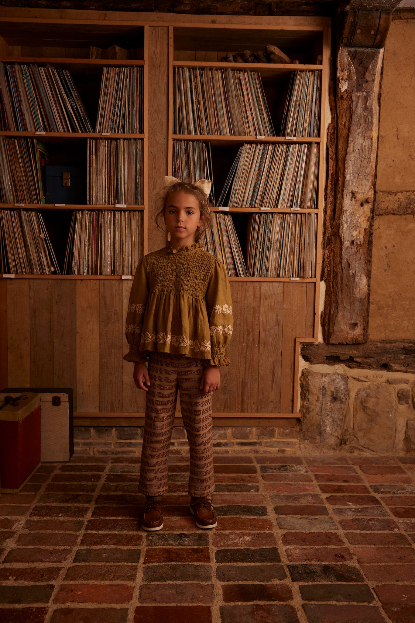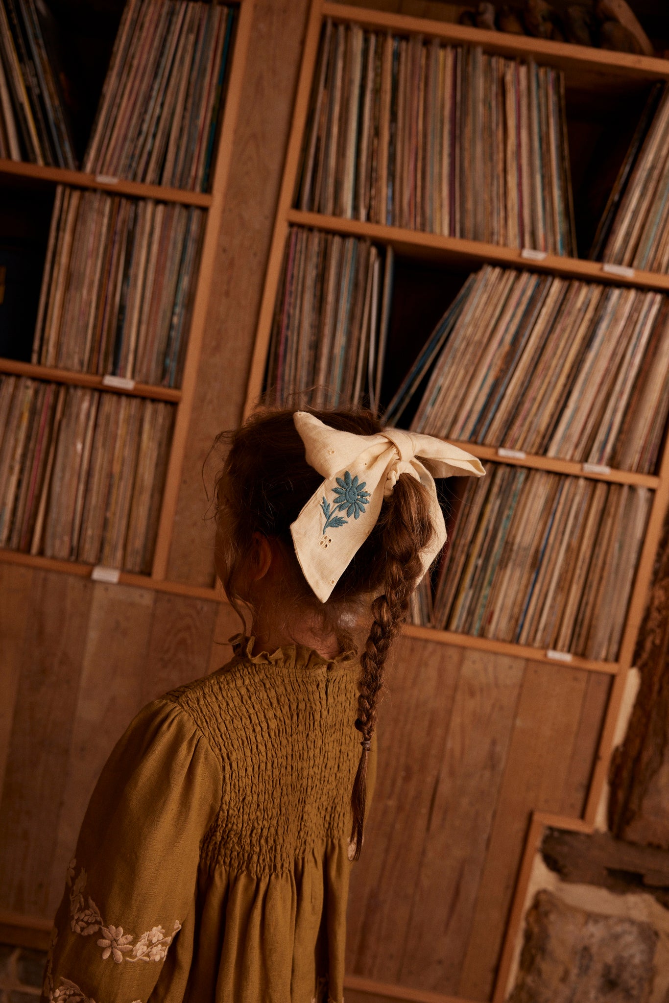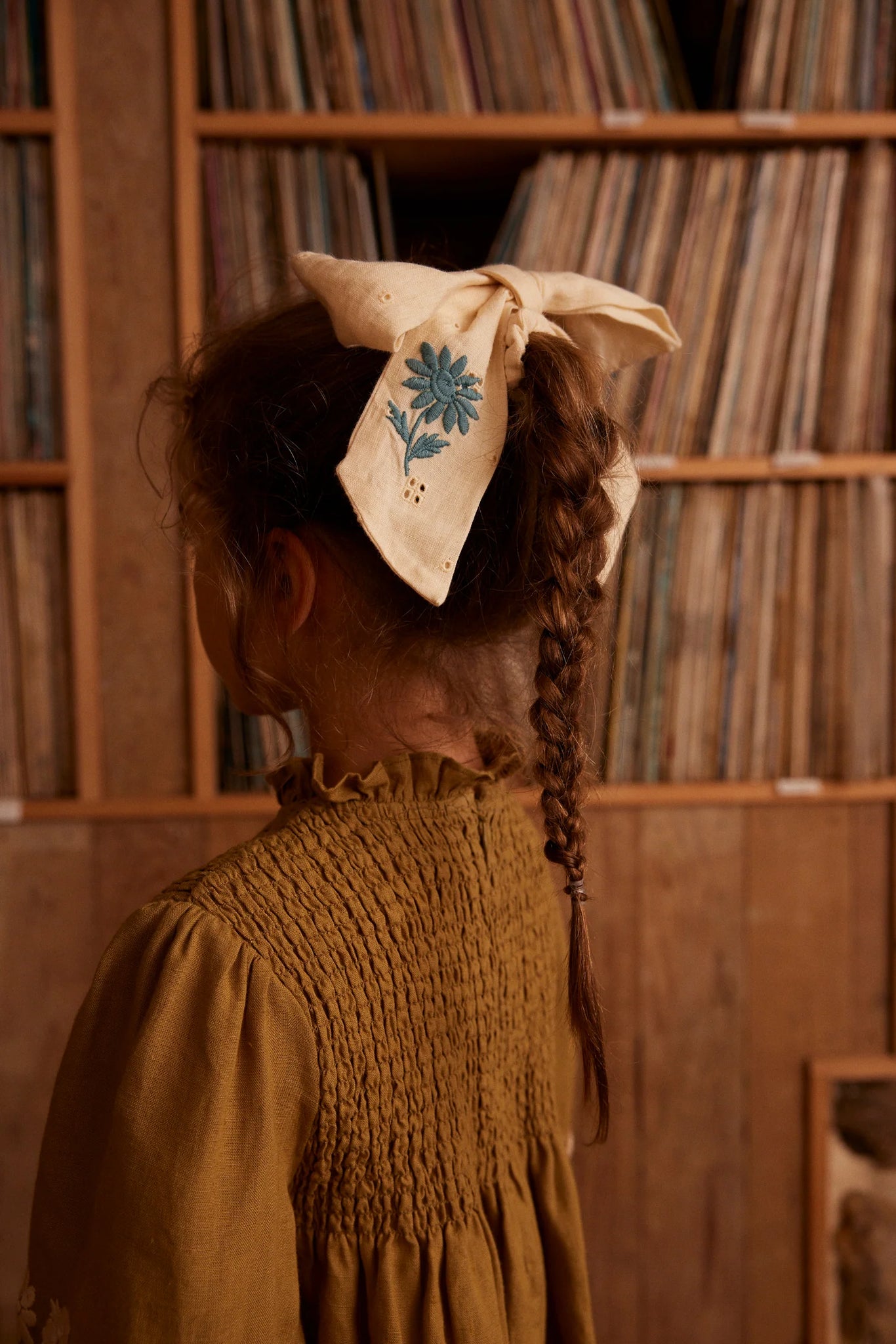 人気の Mia スタイルが、このシーズンはドライドモスリネンを使用したトップスとして登場。胸元とカフスにはゴムシャーリングを施し、袖と裾を囲むようにコントラストのリニア刺繍が施されています。