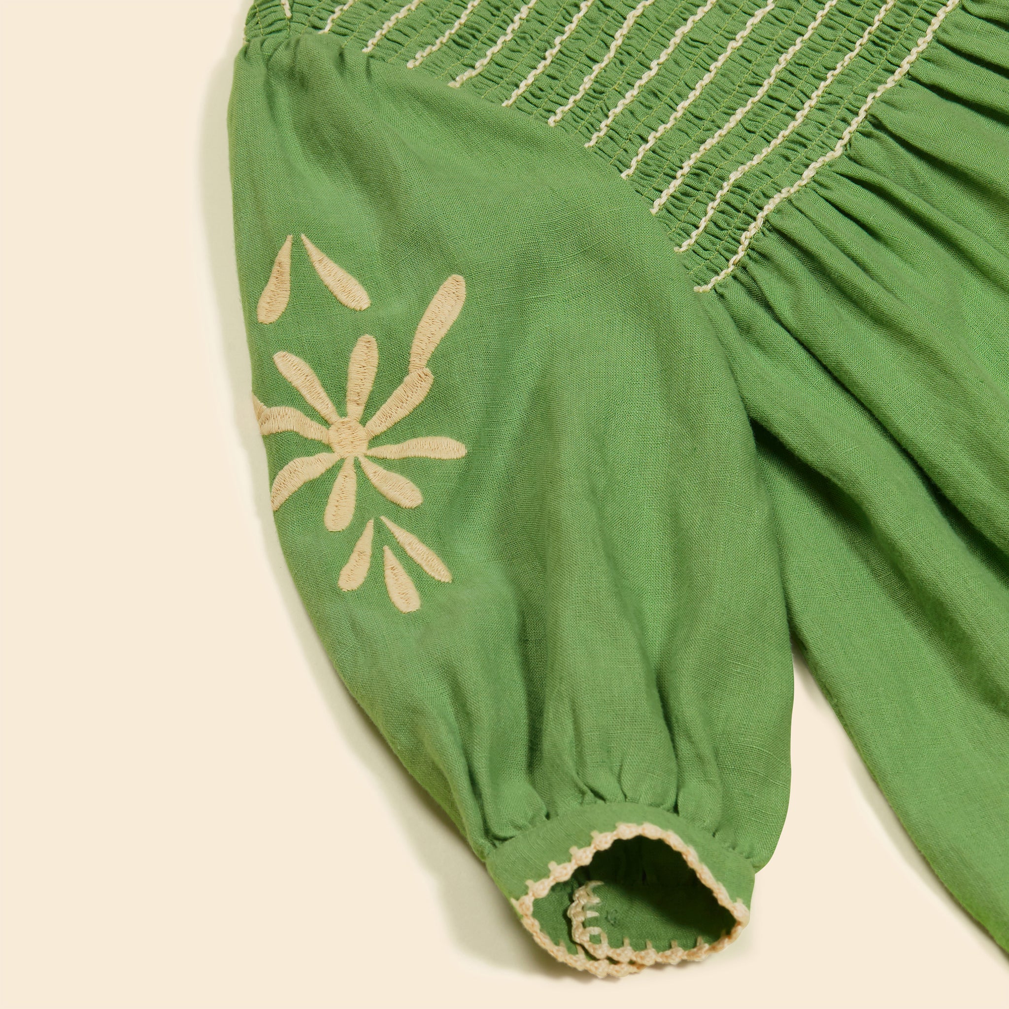 定番になること間違いなしの Noemie ドレスは、美しいレトログリーンのリネンで仕立てられています。胸元にはハンドスモッキング、スカートと袖には Apolina ならではのコントラスト刺繍を施しました。袖口とネックラインにはコントラストカラーのハンドクロシェトリムで仕上げています。