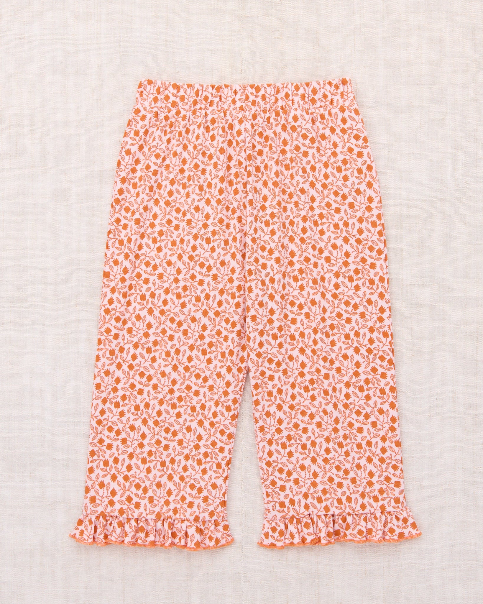 オーガニックピマコットンで仕立てた、リラックス感のあるプルオンパンツ。ふくらはぎまでの丈に、やさしくフィットするギャザー入りのウエスト。コントラストカラーのメロー仕上げフリルの裾も特徴です。