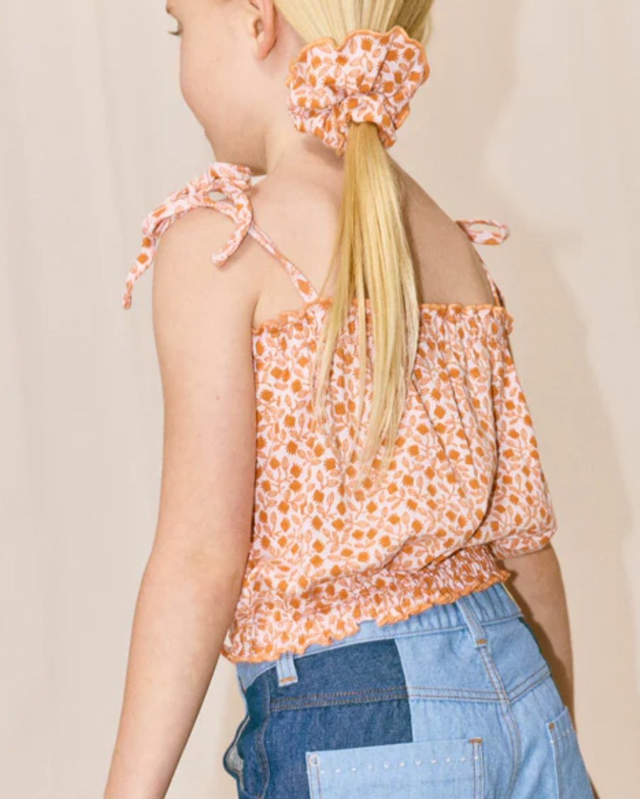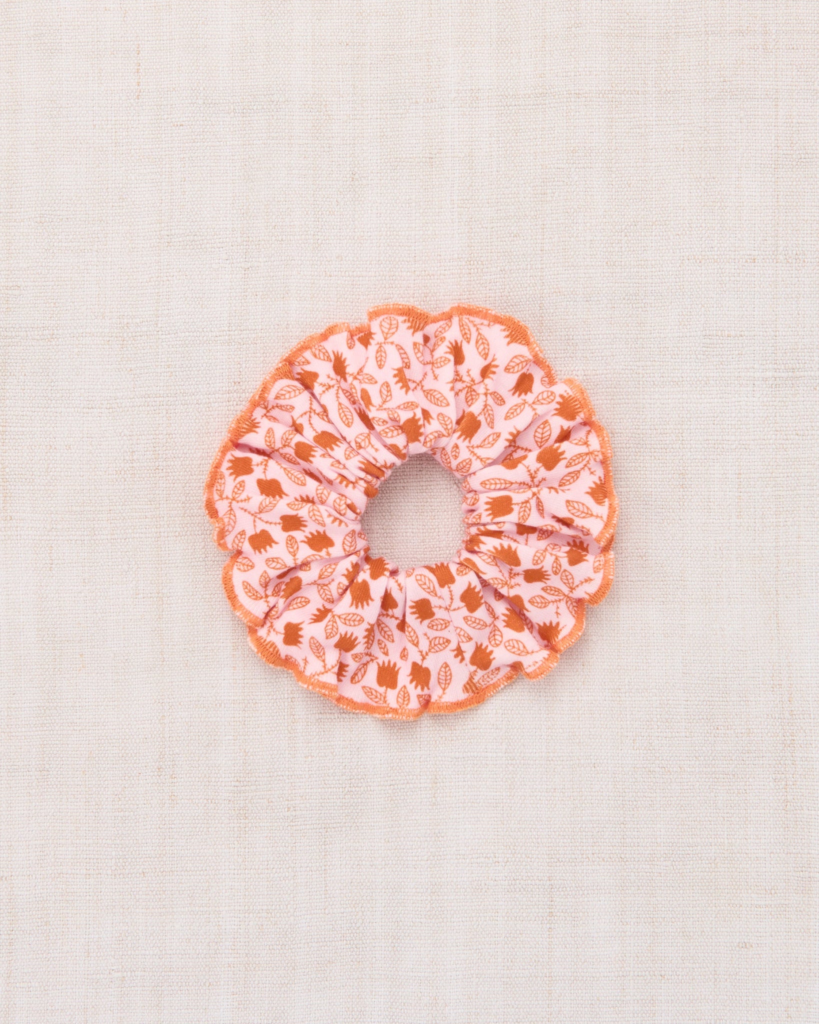 オーガニックピマコットンで仕立てたクラシックなヘアシュシュ。コントラストカラーのメロー仕上げがアクセントで、毎シーズンの余り生地を活かして作っています。さっと結ぶだけでスタイリングが決まり、どんなコーデにも彩りを添えてくれるアイテムです。