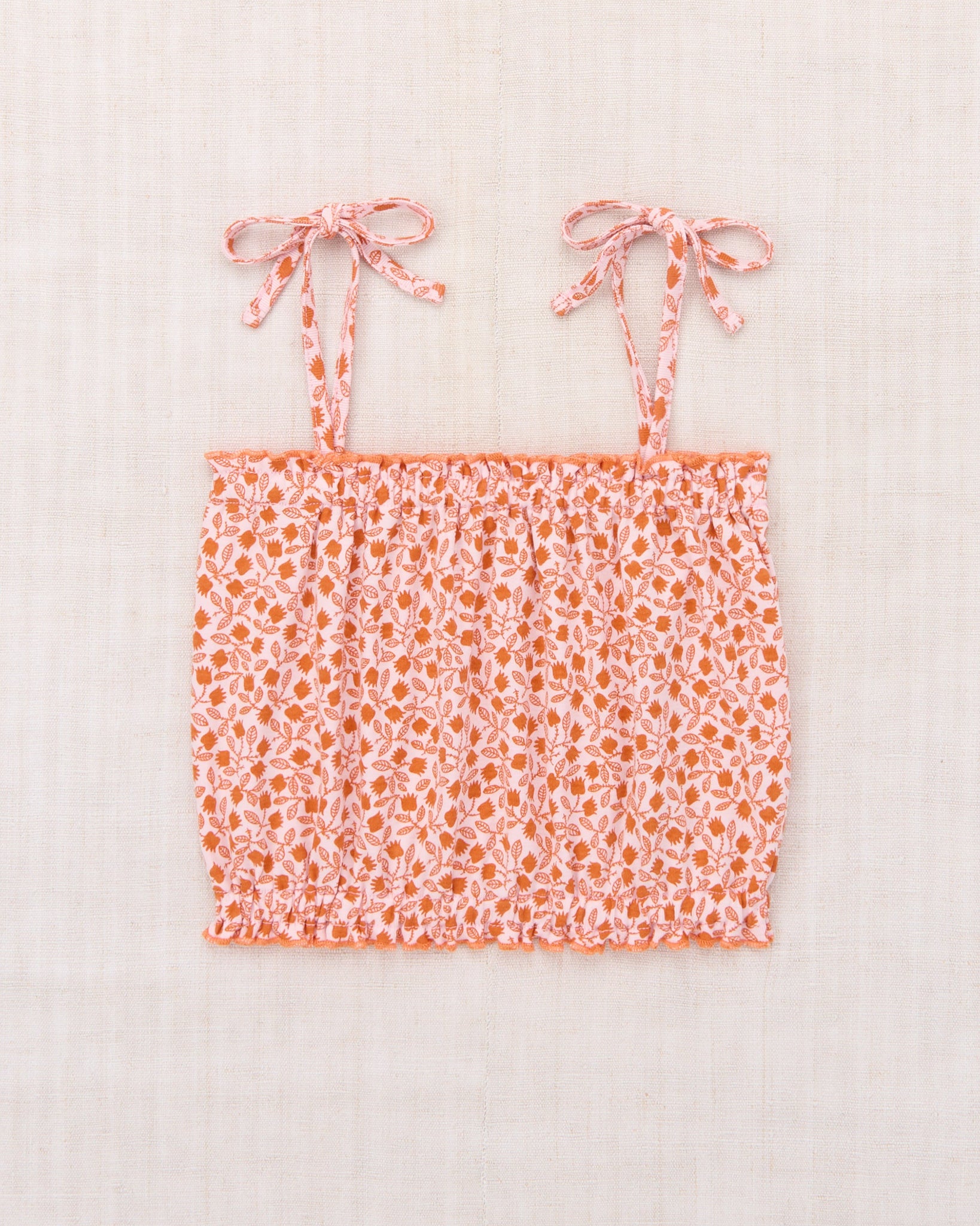 ピーチピンク調のフラワープリントがキュートなキャミソールトップ。ストラップは結べるデザインになっています。胸周りと裾部分はゴム仕様で伸縮性があり、ふんわりボリューミーなシルエットが素敵です。